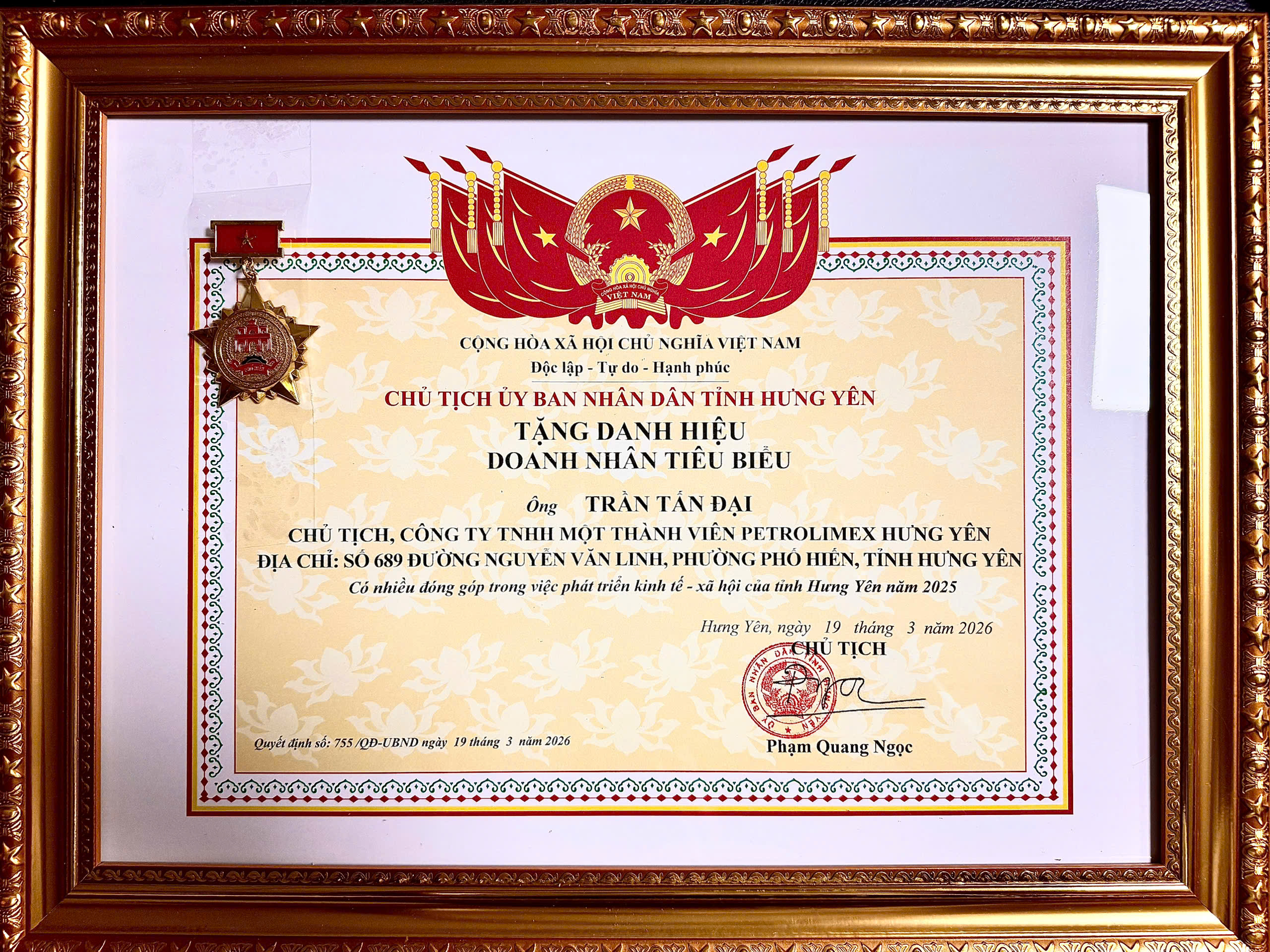 Đồng chí Trần Tấn Đại - Chủ tịch Công ty TNHH MTV Petrolimex Hưng Yên đã được tặng Danh hiệu Doanh nhân tiêu biểu có thành tích xuất sắc trong hoạt động sản xuất kinh doanh, đóng góp tích cực vào sự phát triển kinh tế xã hội của tỉnh năm 2025.